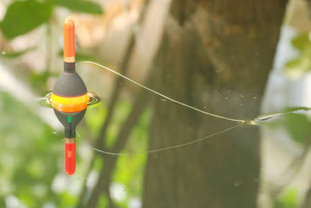 Heavy float for casting fishing gear over the water of the river. Float with fishing line and part of the rod on the background of river water.