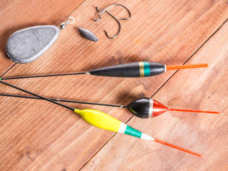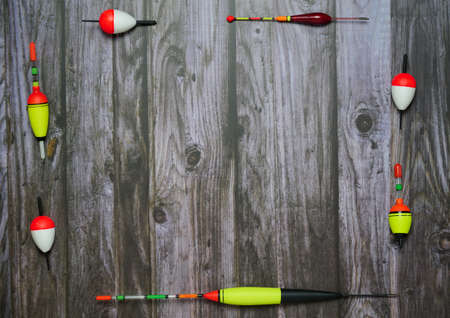 View of fishing accessories on old wooden table. Set of floats of different colors and different purposes.