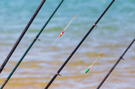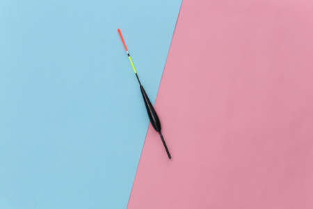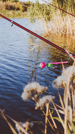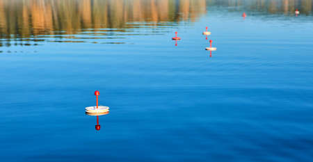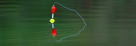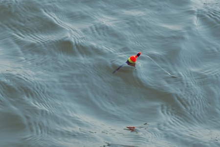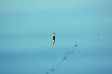 Fishing background. Fishing float on the background of a blurred lake, close-up.