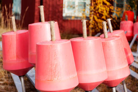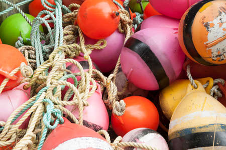 Close up of colorful lobster buoys, Muscongus Bay in New Harbor ME