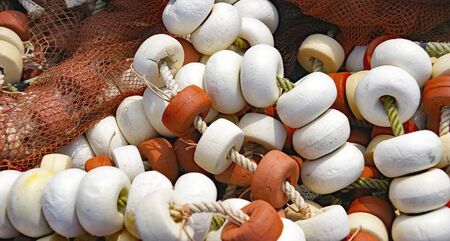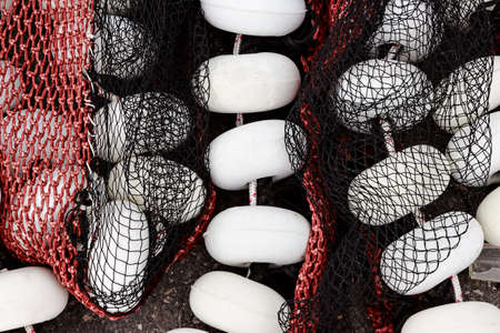 Fishing net black and red with white corks in Santona harbour, Cantabria, Spain. Horizontal image.