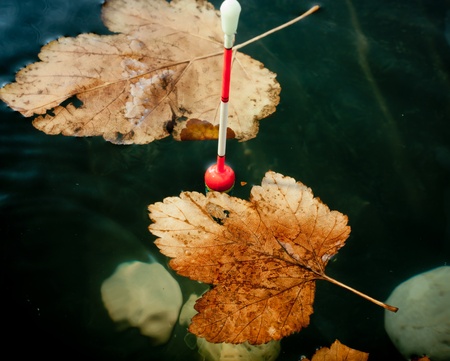 Fishing bobber floating in the small pond. Fishing float in the lake.