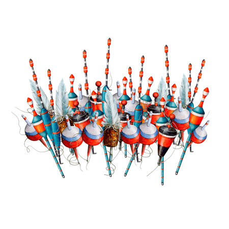Watercolor drawing set of various fishing bobblers, red, white, blue and black with fishing line. Angling gear for wallpapers, logo, banners, icon, cards, leaflets, textiles, postcards, wrapping paper, stickers, wallpapers