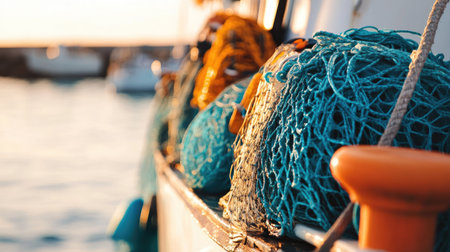 colorful buoys and ropes on the deck of a fishing boat, created with generative ai