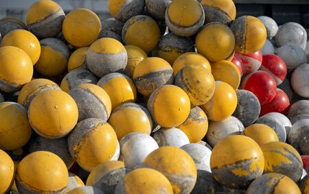 Many of plastic buoys, yellow, red and white color for sporting events covered in bloom after water