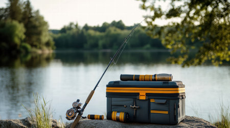 Fishing equipment, including a rod and tackle box, is set on a rock by a peaceful lake, framed by lush greenery in evening light.