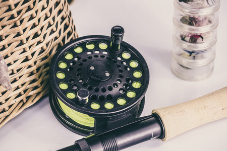 Fishing tackle on a wooden table. Fishing rod, reel, spool and other equipment.