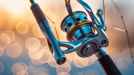 Fishing reel captures sparkling sunlight during sunset by the waters edge