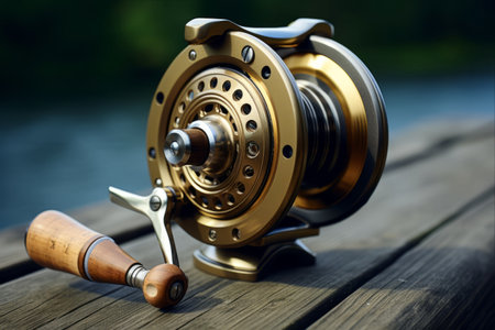 Fishing rod reel on wood background. Equipment close up