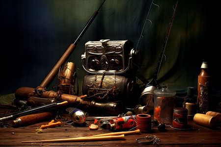 fishing tools and equipment flat lay AI Generated