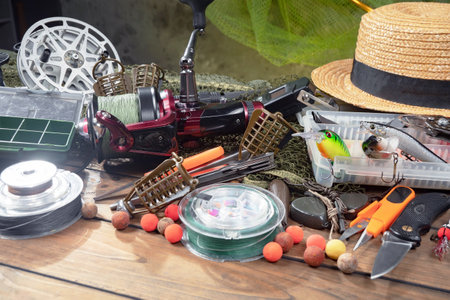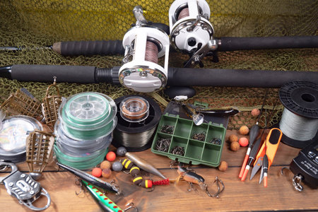Fishing tackle on a wooden table. Accessories for carp fishing.