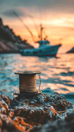 High strength fishing line spool on rocky shore at sunset with fishing boat in background - concept of marine adventure and outdoor leisure. Vertical.