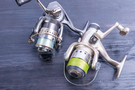 Two spinning reel on a dark wooden background