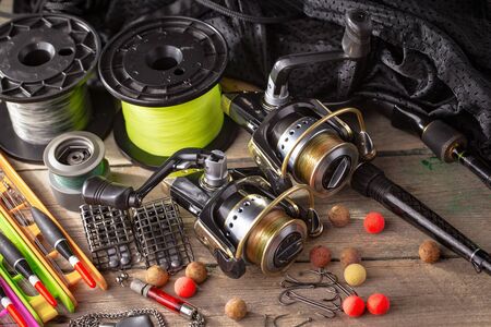 Fishing tackle on a wooden table. Spinning reel, reel, spool of thread and other accessories for fishing.
