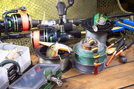 fishing tackle on a wooden table.