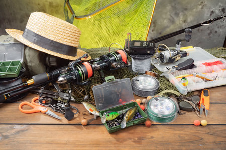 bright different fishing tackles on wooden background. outdoors activity sport and relax