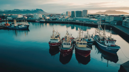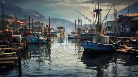 a serene view of fishing boats docked in a harbor during sunset, creating a tranquil atmosphere. The reflection of the boats in the water adds to the picturesque scene. ai generated.