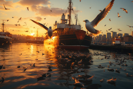 Cargo ship coming with products imported to the port at sunset., generative AI