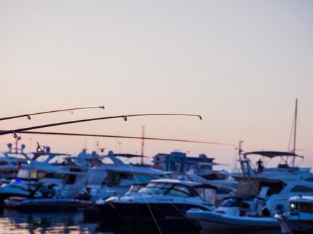 Fishing rods with lines thrown into the sea on a blurred background of yachts and twilight sky