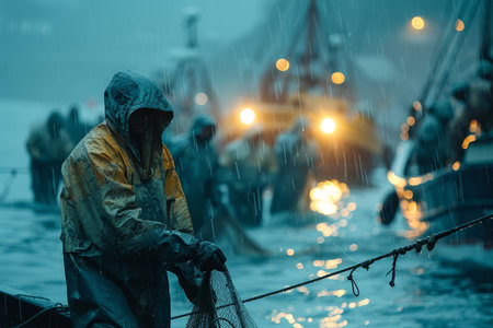 Fishermen wearing waterproof clothing are processing fish on a fishing boat deck in the rain