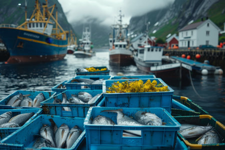 Close up of fresh fish in blue boxes at lofoten islands harbor surrounded by flowers and vegetables