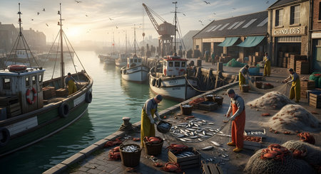 A bustling and atmospheric scene at a traditional fishing harbor at sunrise. Fishermen in workwear are busy on the docks, sorting fresh catches of fish and crabs from their nets into baskets, with fishing boats moored along the quay.