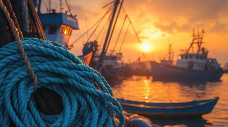 A serene view of colorful fishing boats anchored during sunset, with vibrant blue ropes in the foreground, creating a peaceful marine atmosphere.