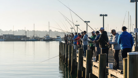 Diverse group fishing on marina dock in morning light.