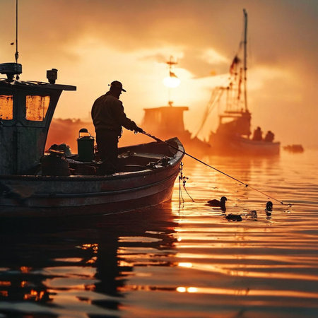 Seasoned fisherman at sea, capturing the essence of marine life and early morning fishing.