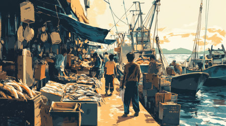 A lively fish market comes alive with workers and visitors engaging in trade along the waterfront. The sun sets, casting a warm glow over the boats and stalls filled with fresh catches.