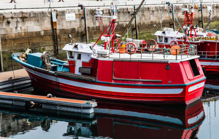 Traditional red fishing boat, moored in the port of La Coruña, Galicia, Spain