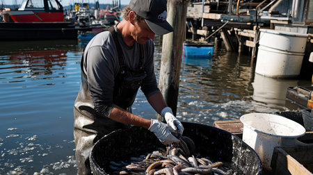 A dedicated fisherman diligently sorts freshly caught eels at a busy waterfront dock, surrounded by boats and the shimmering water of a coastal environment.