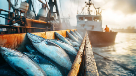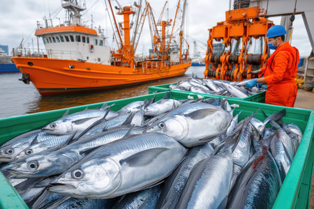 Freshly caught tuna being unloaded at a busy port, highlighting the efficiency of the fishing industry