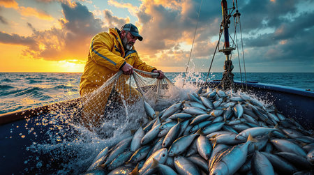 A fisherman with a fresh catch of fish in a net, on a boat at dawn. Evokes tradition, sustainable seafood, and the serene beauty of coastal life.
