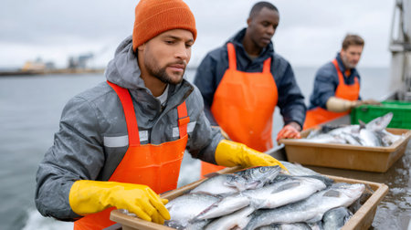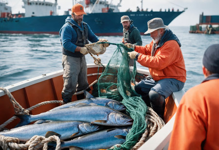 Fishermen sorting fresh fish catch, showing hard work and teamwork on a boat