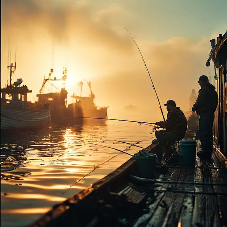 A fisherman fishing net harbor sunset boat silhouette sea dock coastal village calm mood fisherman gather dock sunset near sea harbor boat