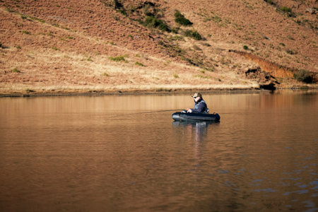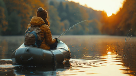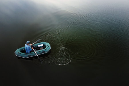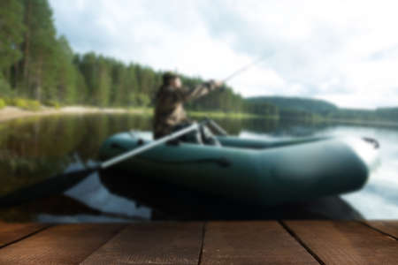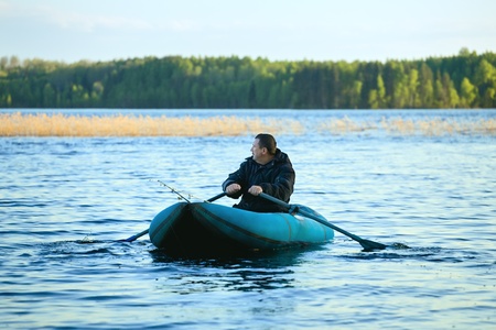 Inflatable boat on the lake at dawn, a fisherman at dawn fishing.