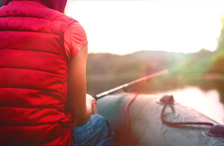 Girl with a fishing rod in hand, sits in a boat and catches fish