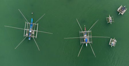 top view of boats and containers with fish in water, Ha Long, Vietnam