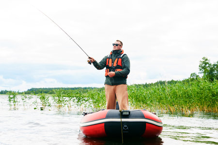Fisherman sits in a boat in his hand with a spinning rod. Happy angler on a sunny summer day.
