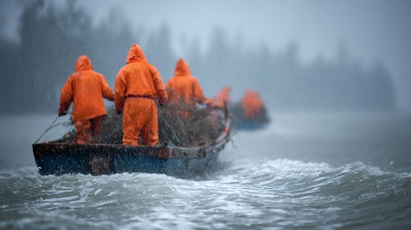 Fishermen dressed in orange waterproof overalls are rowing small boats filled with fishing nets across a rough water surface, fighting heavy rain and turbulent waves