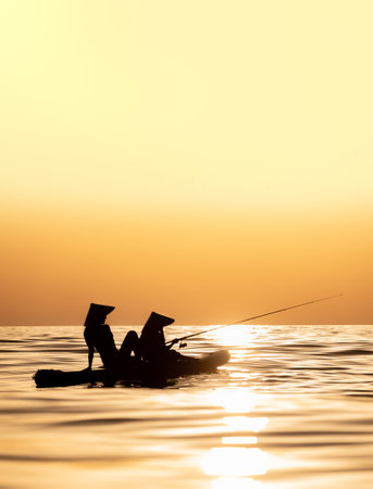 Fisherman fishing on the boat at sunrise. Vintage style.