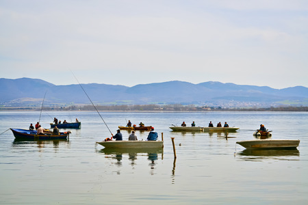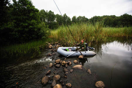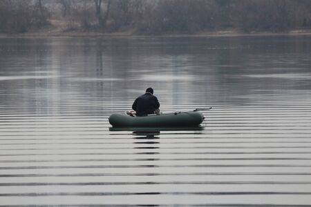 Fisherman fishing on a boat. Early morning spring landscape with river in the foreground and a green bank with bushes and trees in the background. The distant plan is drowned in a thick morning fog