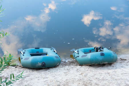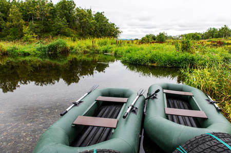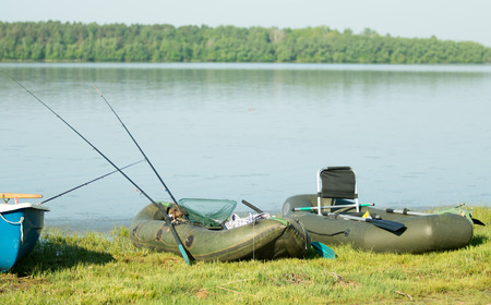 Two rubber boats with fishing tackle in the early morning during the fog, parked on the banks of the river.