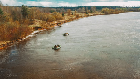 Men Dressed As US American Soldiers Of USA Infantry Of World War II carry out rafting on rubber boats In spring Autumn Day. Group of Soldiers people are preparing to disembark. Aerial view elevated shot