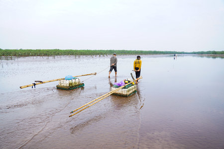 Two men wade through shallow, muddy water, pulling makeshift rafts with bamboo poles, engaged in traditional fishing or aquaculture work in a coastal area.