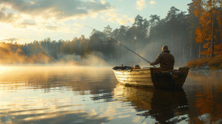Top view of a lone fisherman on a boat in the early morning fishing on the lake.