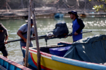 bamboo raft leaning against a lake among traditional fish cages in indonesia, asia