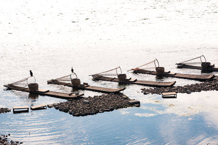 Traditional Chinese fishing boat with cormorant birds. Li river landscape, China