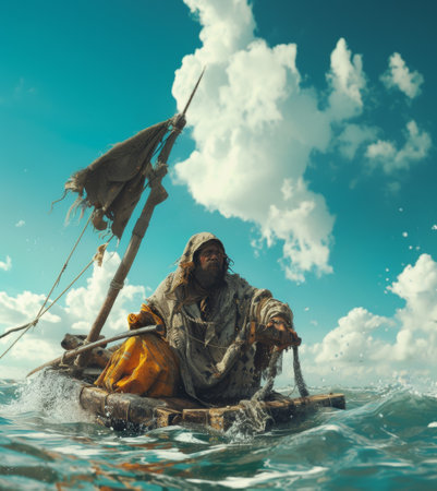 A man in rags on a makeshift raft amidst turbulent seas, under a dramatic sunset sky